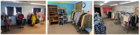 We have had such a fantastic outpouring of donations that we have expanded into the first 2 rooms at the top of the stairs near the nursery. With the help of our volunteers, we have hung and organized a lot of clothes and are open for no-cost shopping!